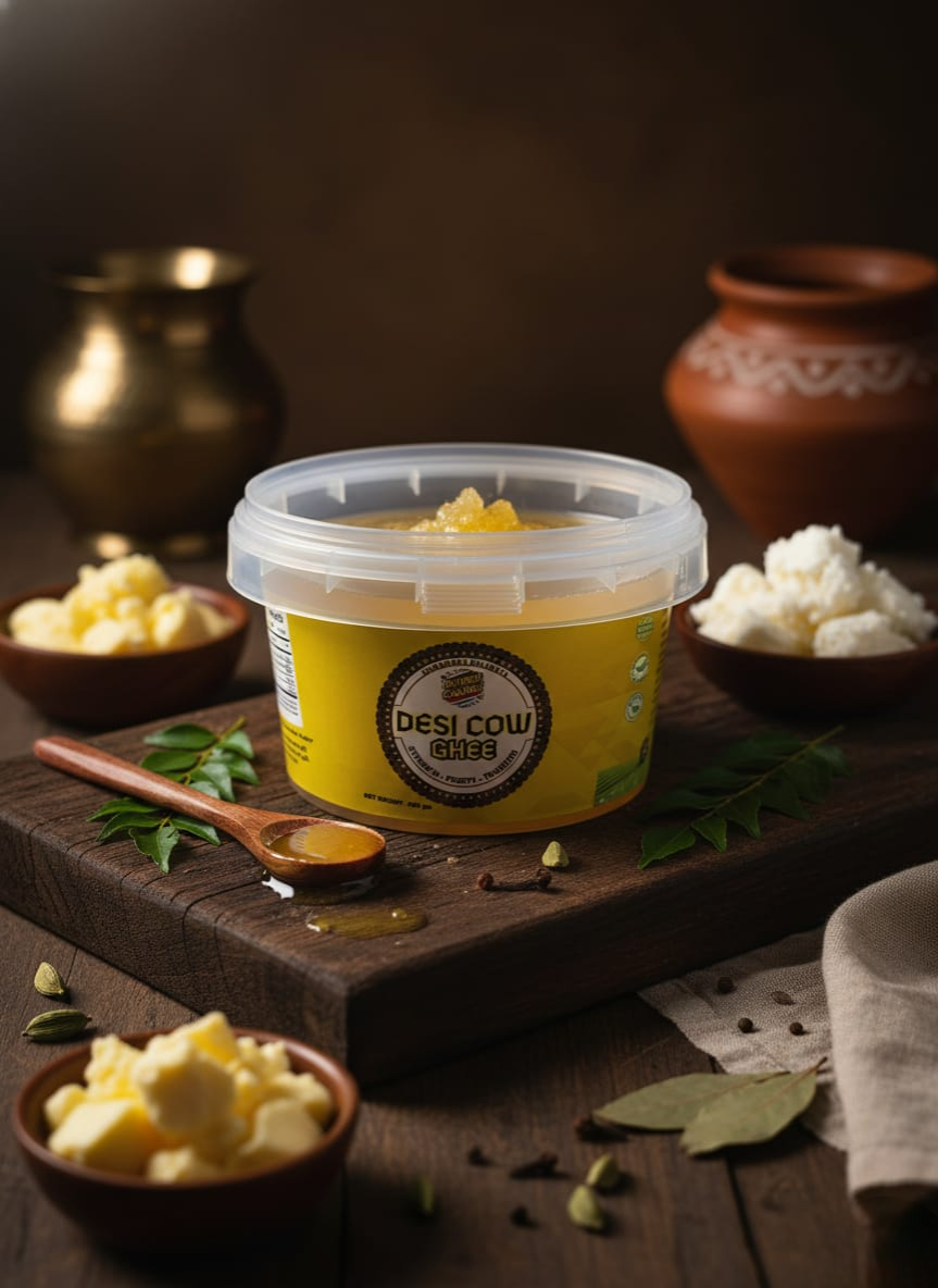 Experience the richness of pure, homemade Desi Cow Ghee crafted in small batches from premium cow’s milk. Slow-cooked for a natural golden glow and aromatic flavor, this ghee supports immunity, digestion, and overall wellness—perfect for daily nourishment.