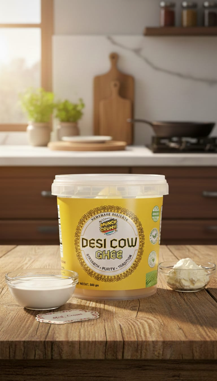 Experience the richness of pure, homemade Desi Cow Ghee crafted in small batches from premium cow’s milk. Slow-cooked for a natural golden glow and aromatic flavor, this ghee supports immunity, digestion, and overall wellness—perfect for daily nourishment.